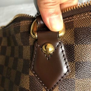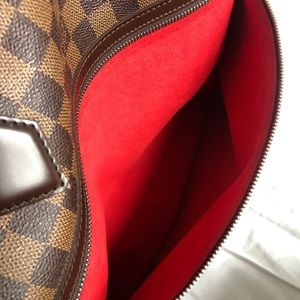 Elegant Louis Vuitton tote with checkered pattern. Features brown leather handles. Stylish and spacious. Zipper is broken.