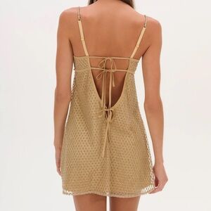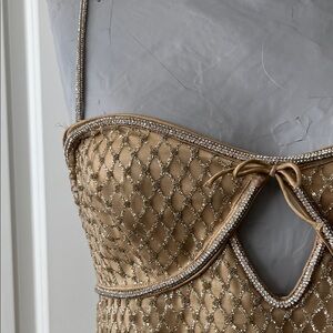 A Highly Coveted FL&L style, the bestselling Glitter gold slip dress enchants all year round. Coated in rhinestone embellishments, this embellished mini dress spotlights keyhole cutout accents.