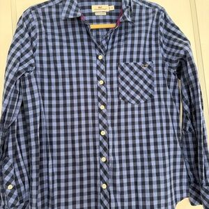 This is a Vineyard Vines women's button-down shirt in a blue gingham print made from a cotton-cashmere blend.