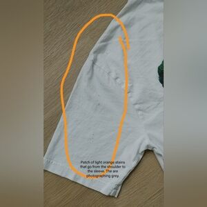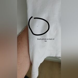**Faint yellow/orange-ish stains on back shoulder.Pinhole on back of tee*