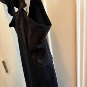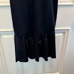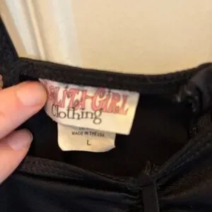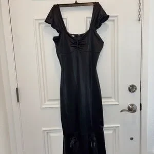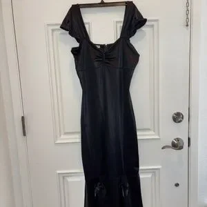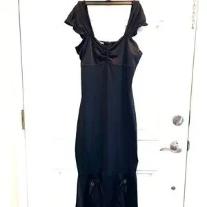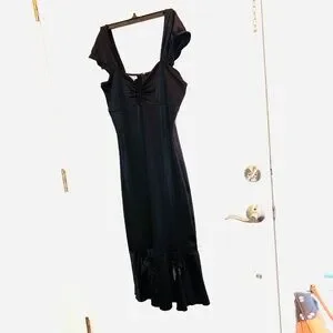 Spandex / Nylon Pinup Black Wiggle Dress, Sweetheart Neck line, size LG (rns small) by Lolita Girl Clothing. Worn once. Feels like a Medium especially considering it is 20% Spandex. Blow ruffle bottom skirt, Great Condition. Vintage Retro Cut, accents waistline to hip ratio well. Midi