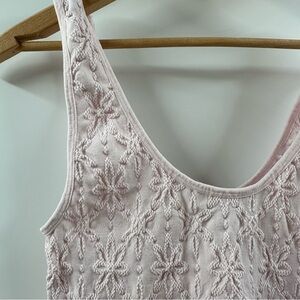 Forever 21 cropped tank top in a soft light pink shade, featuring delicate light pink floral stitching throughout for a subtle, textured look. Size is between a medium and large — offers a slightly relaxed fit. Feminine, lightweight, and perfect for layering or wearing on its own during spring and summer.