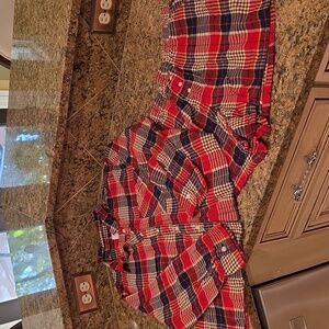 Comfortable plaid pajama set. Includes button-up top and matching shorts. Ideal for relaxing.