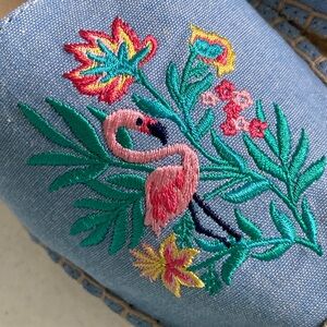Stylish blue espadrilles with colorful flamingo embroidery. Tan straps for comfort. Perfect for casual wear.
