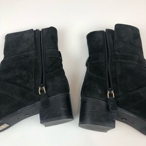 VGUC Stuart Weitzman Britain Buckle Suede Ankle Boots, size 9.5M women's, black with gold tone metal accents, MSRP $650. Favorite designer of many celebs including Meghan Markle ! Add at a touch of royalty to your fall wardrobe with this go to boot! 100% Calf-skin leather. Some light wear as shown from normal use. Said to run TTS.