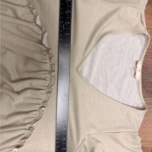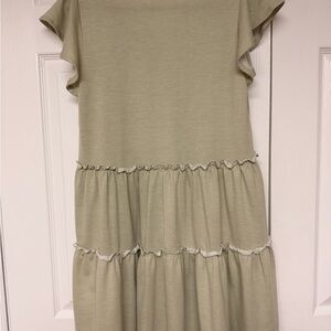 Soft and flowy Alter’d State dress in a pale heathered olive green. Features a flattering V-neckline, short flutter sleeves, and a relaxed babydoll silhouette. Tiered seams with subtle ruffle detailing add texture and movement. Lightweight knit fabric with a soft, comfortable feel—easy to dress up or wear casually.
