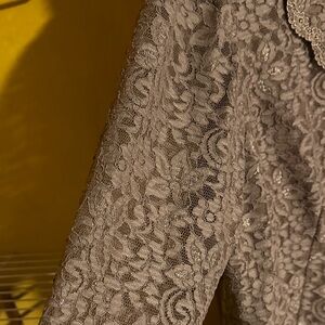 Elegant lace blazer with scalloped edges. Ideal for layering. Adds sophistication to any outfit.