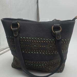 Elevate your style with this chic studded tote bag. Perfect for any occasion, it combines fashion and functionality effortlessly. Measures 14w x 11"t x 4.5"d Handle Tote 10".