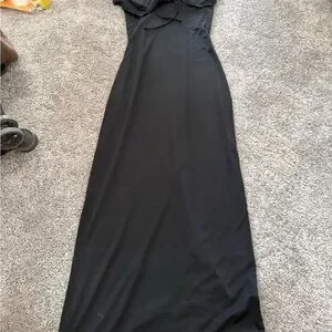 Chic black midi dress with ruffle detail. Perfect for elegant occasions.
