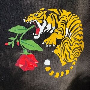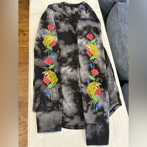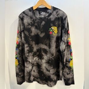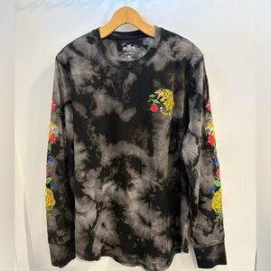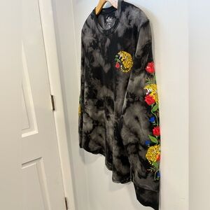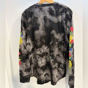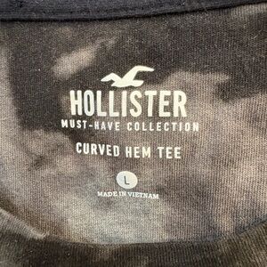 Curved hem tee with a stylish black and gray pattern. Ideal for everyday wear.