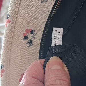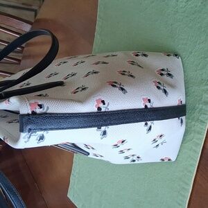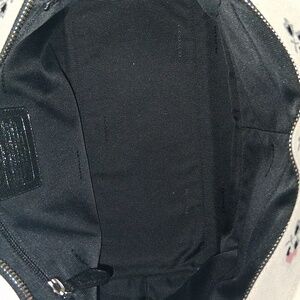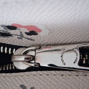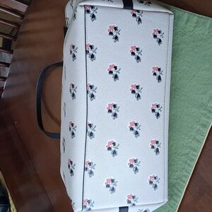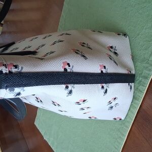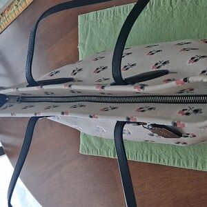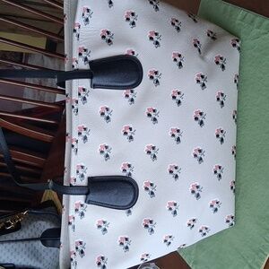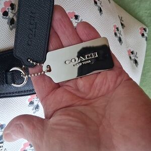 This beautiful Coach crossgrain leather tote. Bramble rose design with a white background with pink, black, and gray floral design. Black handles, and zipper closure. Inside has two open pockets, one zipper pocket. No stains, no peeling, no cracking, and no fading. Measurements: 16" W × 11" H. Tag number: L1481 36357. In great condition.