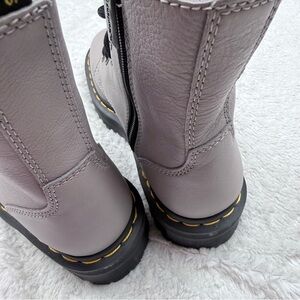 Classic gray combat boots with sturdy black soles. Features lace-up design and durable construction.