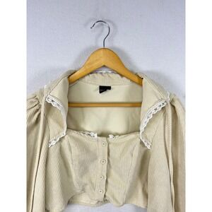 A beige corduroy cropped top with puff sleeves and a square neckline. Features a button-up front and delicate lace trim along the neckline and collar. Perfect for a casual day out or a stylish evening event.