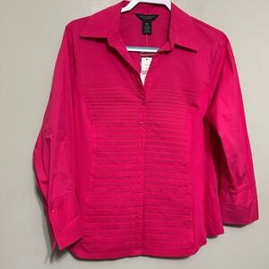 Elevate your everyday style with this vibrant pink button-down shirt from Investments. Delicate pleating adorns the front, creating a flattering silhouette that adds a touch of sophisticated texture to your look. The 3/4 sleeves offer a chic and versatile option for any season, making it perfect for layering or wearing on its own. This polished piece transitions effortlessly from the office to a casual brunch.