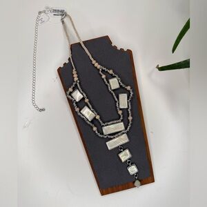 Beautiful Free People boho statement necklace featuring rectangular shell inlay panels framed with silver-tone spacer beads and light wood accents on braided cord. Adjustable chain extender allows for versatile styling. A neutral, eye-catching piece that works year-round.