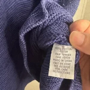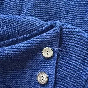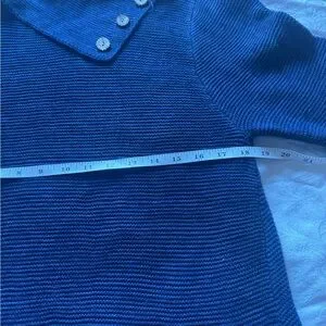 Stylish blue knit sweater featuring a unique button detail on the collar. Perfect for a cozy and chic look.