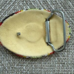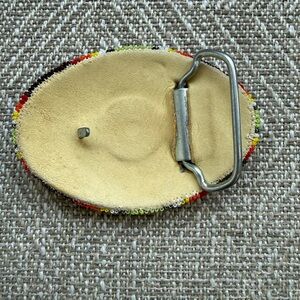 Add a vibrant touch to your outfit with this handcrafted beaded belt buckle. Featuring a stunning mix of brown, red, yellow, and green beads, it's perfect for making a bold statement.