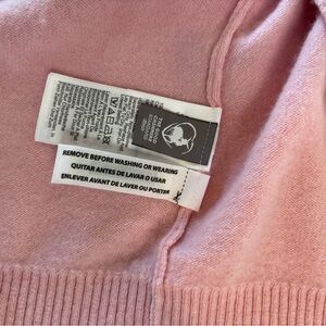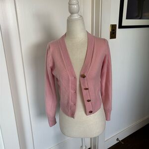 Chic light pink cardigan with button-up front. Features ribbed cuffs and hem. Stylish V-neck design.