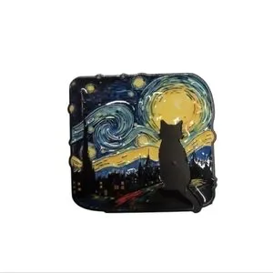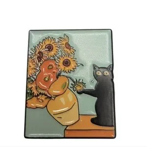 Set of 2 enamel anime pins charactizing a black cat in van Gogh's renowned Starry Night and Sunflowers paintings. The Starry Night pin measures 1" x 1" and the Sunflowers measures 1 1/4" high x 1" wide. Both have solid black backs with push pin clasps. Wear individually or together!