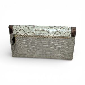 The Brahmin Soft Checkbook Wallet in dark brown crocodile-embossed leather is a stylish and practical accessory for women. This wallet features a checkbook design, making it convenient for keeping track of finances. The wristlet style adds a touch of elegance, while the high-quality leather material ensures durability. The neutral beige color adds a versatile touch to any outfit, making it a must-have for any fashion-forward woman.