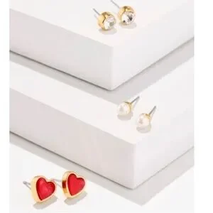 This 3 pair set features a red heart shaped, sparkly rhinestone & round pearl pairs. A great addition to your jewelry box!
