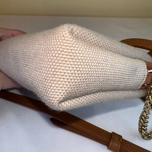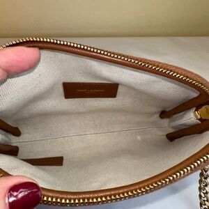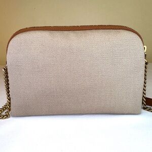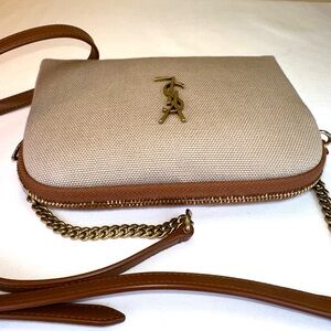 Saint Laurent NWT Gaby mini camera bag in beige Desert Dust canvas with Brick tan leather trim. Made in Italy. Bronze toned hardware. Holds a phone. Comes with box and dustbag. Already authenticated with COA. Adjustable leather shoulder or crossbody strap. Zipper top opens to tan canvas interior. Still on website and Tag shows $1250 new. Beautiful bag.