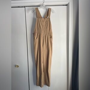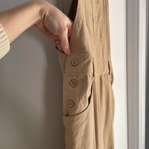 Chic tan jumpsuit with front pocket. Functional side buttons and pockets.