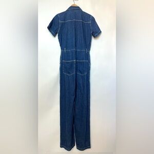 Denim - your uniform since forever. James Denim Jumpsuit from Reformation, a full length, short sleeve jumpsuit with a collared neckline. Pockets. Belt loops.