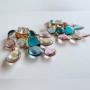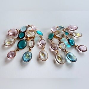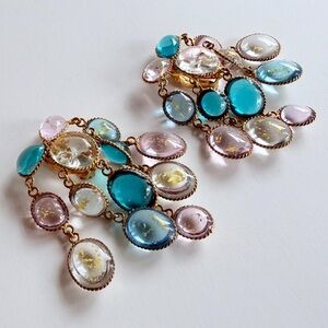 Vintage French Gripoix Poured Glass Chandelier Earrings Pink Blue Gold Leaf Foil