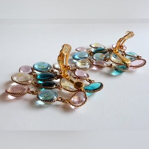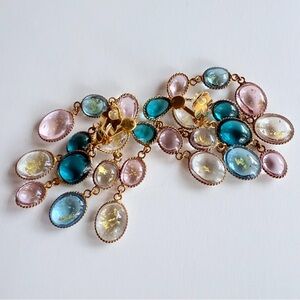 Stunning French vintage chandelier, shoulder-duster style, earrings comprised of gripoix poured glass droplets in shades of aqua, pink, turquoise and colorless pate de verre - several with gold leaf foil inclusions - set with gilt metal. Clip-on closure. About 3 inches or so in length. A real statement piece, absolutely gorgeous, and very rare.