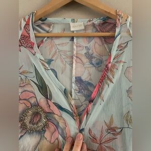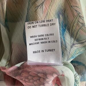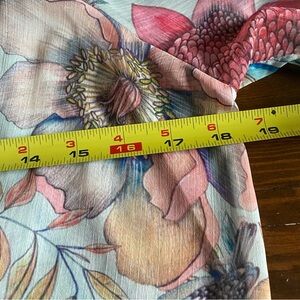 Very good preowned condition with no apparent flaws. Lightweight, airy, floral kimono with flutter sleeves and ruffle hemline. No pockets or belt. Open v-neck.