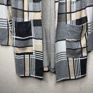 -Elevated and effortlessly chic, this Frank Lyman cardigan jacket features a modern plaid pattern in versatile neutral tones of gray, beige, cream, and black. Designed with an open-front silhouette, it layers beautifully over tees, blouses, or lightweight knits—perfect for work, travel, or everyday polish.