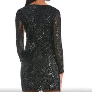Step into the spotlight with this Gianni Bini mini dress, featuring a dazzling all over black beads and sequin embellishment that shimmers with every move. The bodycon fit and plunge neckline create a striking silhouette, perfect for a night out. Long sleeves add a touch of elegance to this cocktail-ready piece.