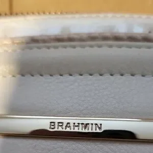 Stylish Brahmin satchel in gray/taupe. Features a textured design. One zipper pocket and 2 inside slot pockets. Outer pocket as well. Missing hangtag. Perfect for any occasion.