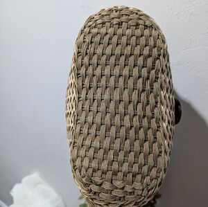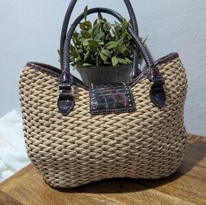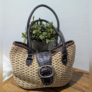 This stylish woven handbag features a sophisticated tan and brown design, perfect for any occasion. Its elegant look is complemented by durable handles and a chic buckle accent.