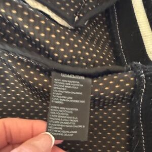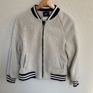 Soft cream sherpa jacket. Features black and white striped trim. Ideal for layering.