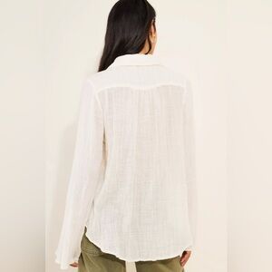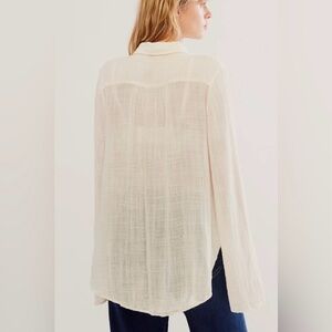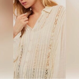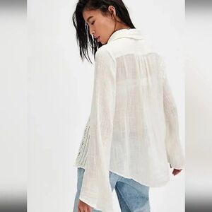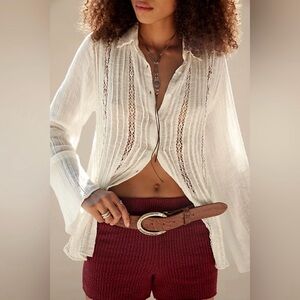 Billowy buttondown in an open-knit fabrication w/ shirttail hem and bell sleeves