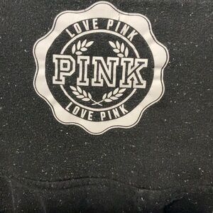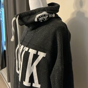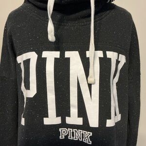 VS Pink black and white speckled sweatshirt with white logo on front and logo on side of neck. No need. Big turtleneck.