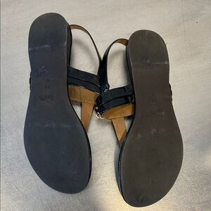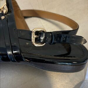 Coach Glossy Black Sandals with Metallic Gold Detail