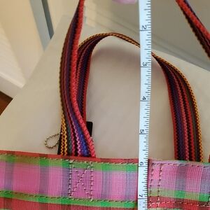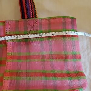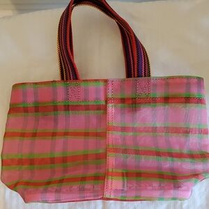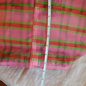 Bright plaid design with pink and green hues. Perfect for adding color to your look. Spacious and durable for daily use.