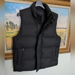 Beautiful black heather wool blend down vest from Nobis. EXCELLENT quality on par with Canada Goose. Very warm and great weight with signed double zippers. Like new condition no flaws and size Large.