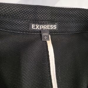 Chic cropped moto jacket. Black textured fabric. Silver hardware. Features an asymmetrical zipper. Ideal for a modern look.