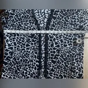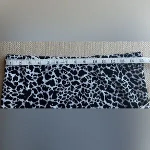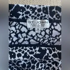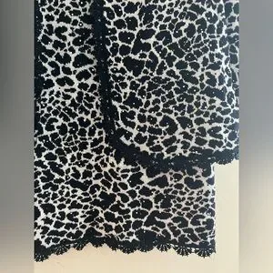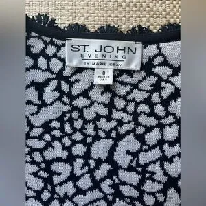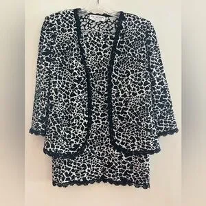 This St. John cardigan and skirt feature a distinctive black and white animal or leopard print with fringed trim along the opening and 3/4 sleeves. The cardigan has four hook/eye closures and the skirt has an elastic waist.