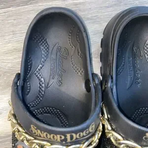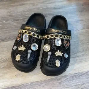Step out in bold hip-hop style with these Skechers x Snoop Dogg limited edition clogs. Featuring a black base with rhinestone-studded uppers, removable bling charms (microphone, crown, dollar sign, and gem), and a gold-tone chain across the strap. The strap is branded with Snoop Dogg in metallic gold lettering.