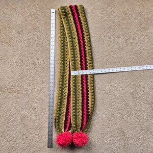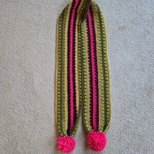 I bought this scarf because I thought it looked like flowering cacti. It's Lucky Brand, but there is no fabric content tag. Feels like acrylic. Showing a tiny bit of friction wear (mostly on the pom-poms), but overall in excellent condition. No damage, pet hair, or odors.