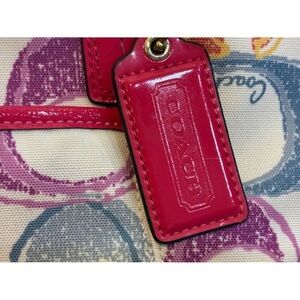 This Coach F21910 Signature Scribble Carryall Bag from 2013 is just adorable! Featuring Signature Canvas in a Scribble pattern in pink, yellow, purple, blue and yellow with pink patent leather trim and straps, this large bag is both stylish and functional with an attached shorter strap and a removable/adjustable longer strap for multiple carry options.
