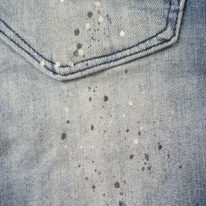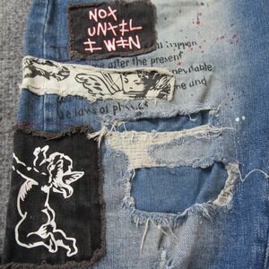 Shows intentional heavy distressing, patchwork, and paint-splatter design. Raw cut hems with loose threads; no damage beyond the design.