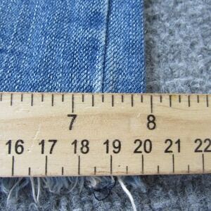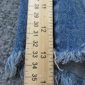 Features: Five-pocket styling, belt loops, button waist, raw frayed cutoff hems