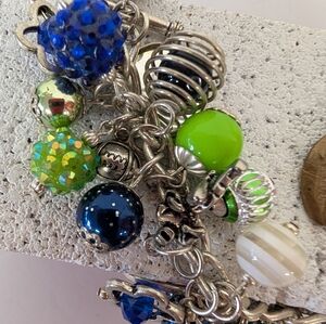 Seahawks silver charm bracelet featuring vibrant blue and green beads helmet beads. This bracelet comes with a single 15 inche chain football necklace. Perfect for adding a pop of color to any outfit.