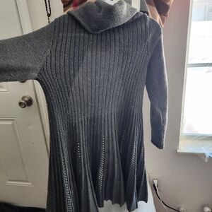 Chic charcoal sweater with a flowing cowl neck. Features elegant ribbed texture. Ideal for stylish layering. Please see the texture of sweater, some pilling.
